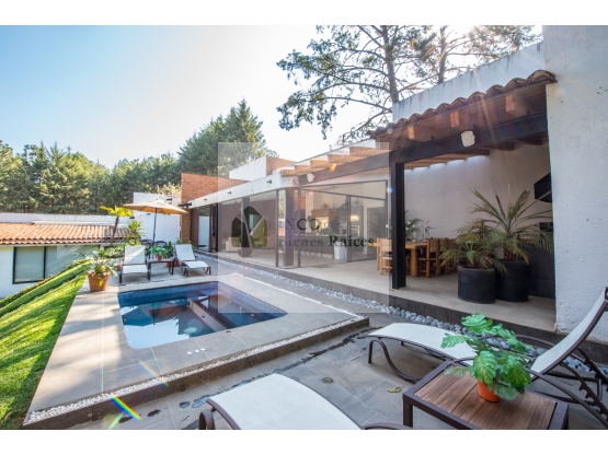 La propiedad cuenta con 4 recámaras, sala, comedor, cocina, terraza amplia, jardín enorme  y jacuzzi donde podrás gozar de la naturaleza al 100 por ciento.