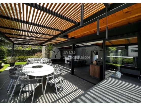 Recibidor y baños completo, cocina moderna con isla, comedor a doble altura, sala interior com chimenea y ventanales corredizos que unifican exterior e interior. Al exterior, sala y comedor con asador; por su ubicación la casa queda con un jardín frontal y alejado del ruido de la alberca.